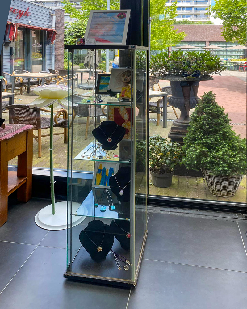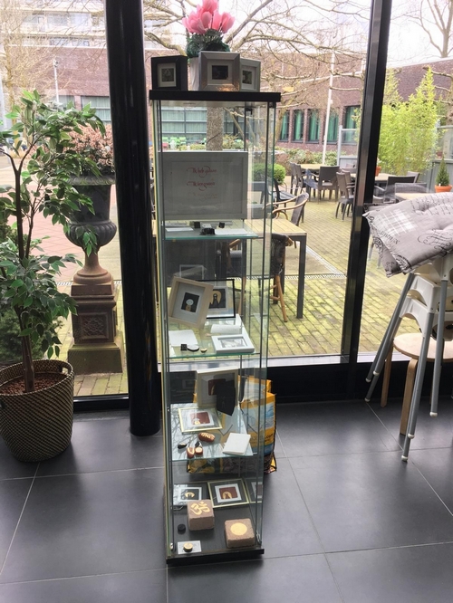 De vitrines zijn nu in ere hersteld. Het is een wisselende expositie. Tot en met juni lieten Eric Hage en Anneke Kroonenberg hier werk zien.